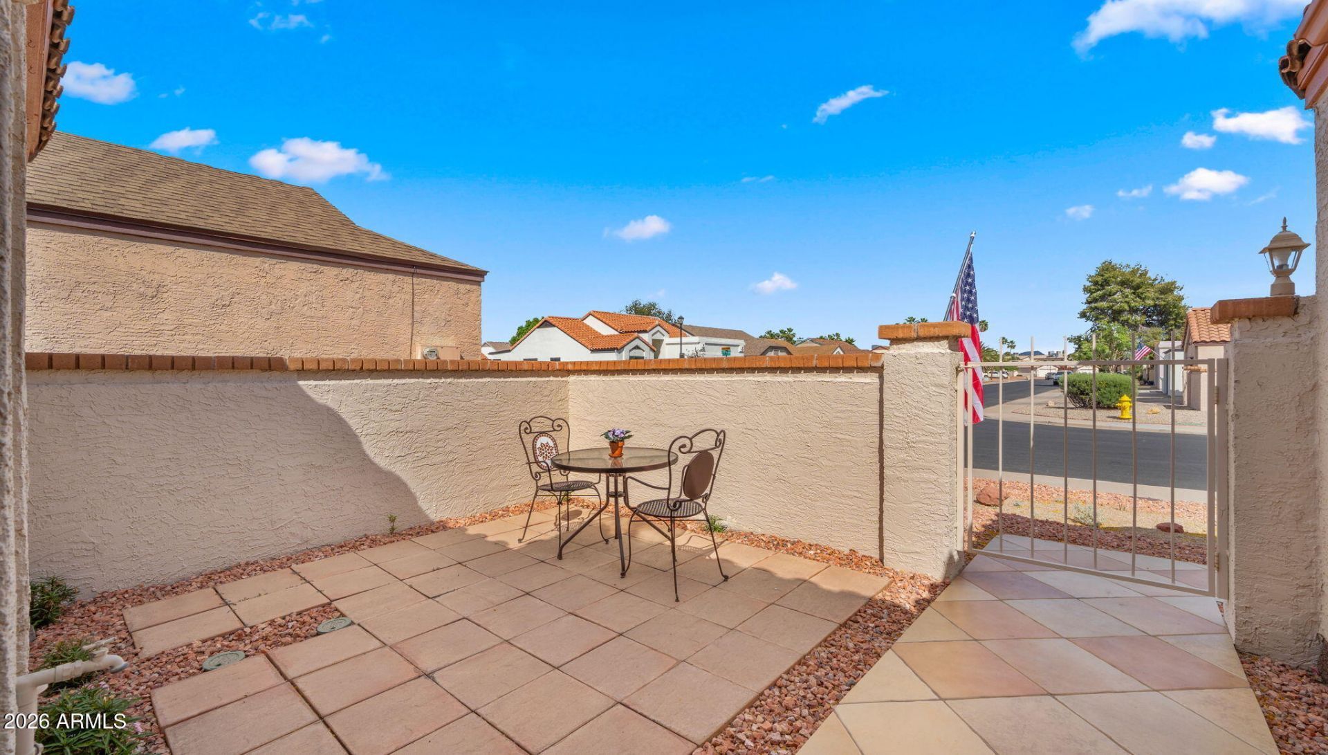Welcome to this beautifully maintained home featuring a bright and open floor plan with vaulted ceilings throughout, including the bedrooms, creating a spacious and airy feel from the moment you walk in.The kitchen has been tastefully updated with painted cabinetry, quartz countertops, a granite composite sink, and modern can lighting (fluorescent lighting removed), along with a cozy eat-in dining space perfect for everyday living. A convenient pantry adds extra storage.Youll appreciate the large tile flooring that flows through the main living areas, offering both durability and style. Additional updates include painted cabinets and countertops in bathrooms completed in 2022, along with updated sliders and windows for improved efficiency.The split floor plan provides privacy, with generously sized bedrooms featuring vaulted ceilings and ample closet space. The primary suite offers a walk-in closet, with a functional layout where the vanity is open to the bedroom and the shower and toilet are privately enclosed.Out front enjoy a gated, east-facing courtyard--perfect for morning coffee--as well as a large tiled back patio, and yard with low-maintenance artificial turf and a block wall for added privacy. Security screen doors add both comfort and peace of mind.Additional features include a spacious coat closet and washer/dryer located in the garage.This home combines thoughtful updates, functional design, and low-maintenance living--ready for its next owner to enjoy!