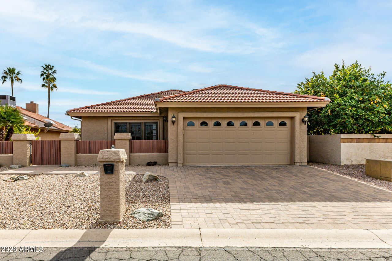 RARE GOLF COURSE VIEWS FRONT & BACK & coveted SOUTHERN exposure in your backyard to enjoy the winter sunshine warmth. On chilly winter evenings, lower the patio shades (the large one motorized), turn on your table fire pit, add as much or as little lighting as you want, and enjoy the outdoors even on chilly nights. NEWER ROOF in this 2 BDRM + DEN / 2 BATH KACHINA FLOOR PLAN is perfectly positioned bringing in LOTS of natural light. VAULTED CEILINGS create an open, spacious feel & NEWER RENEWAL BY ANDERSEN SLIDERS (2025) enhance the indoor-outdoor flow. The WRAP AROUND PAVERED PATIO & DRIVEWAY elevates the curb appeal. EPOXY GARAGE offers a clean, finished look. Golf course VIEWS IN EITHER DIRECTION, is a standout opportunity in the 40 & over community of Palo Verde!