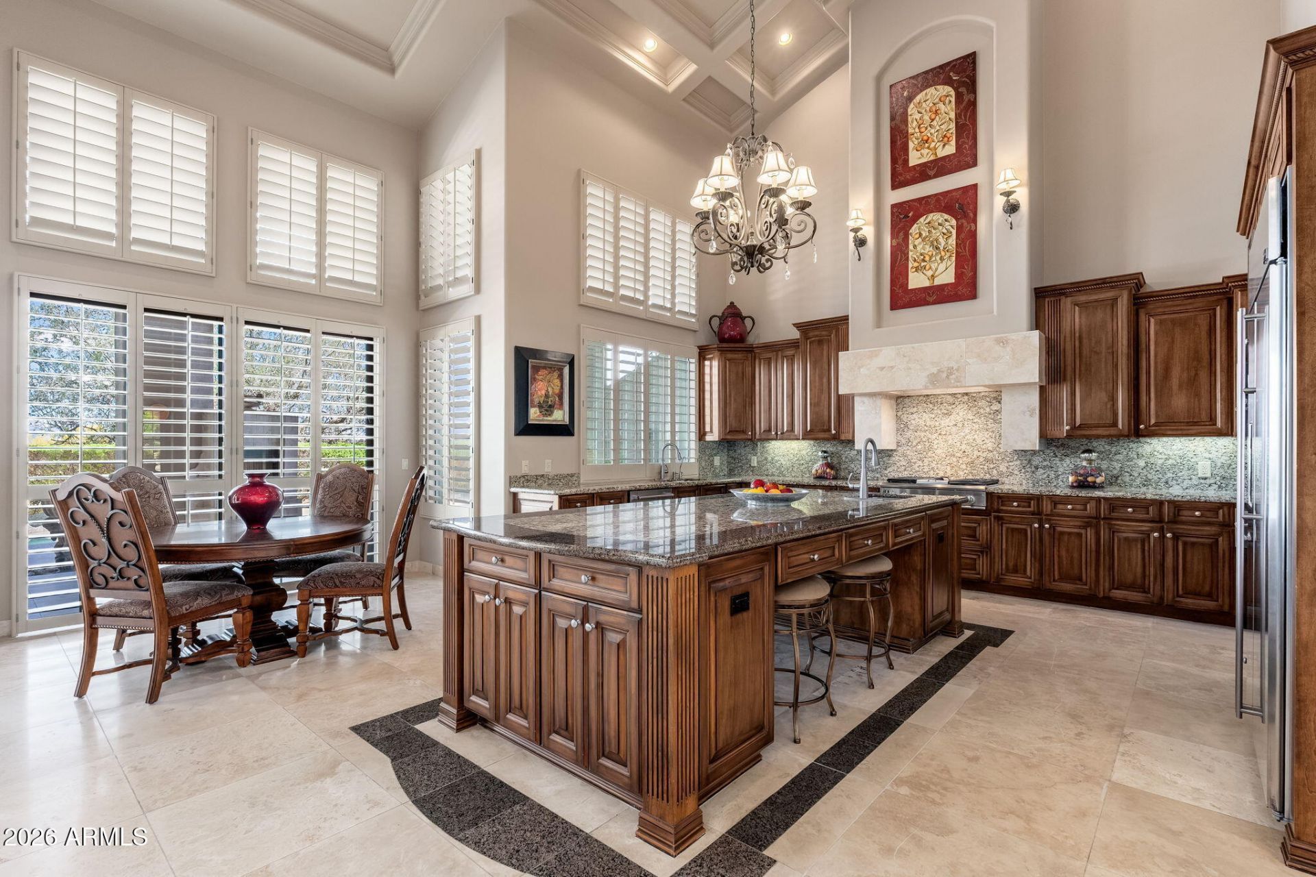 Set against a breathtaking backdrop of mountain and desert views, this elegant estate is located within the guard gated community of Troon Mountain Estates, positioned on the desirable southeast slope of Troon Mountain and surrounded by the natural beauty of the McDowell Sonoran Preserve. Offering close proximity to shopping and dining, this residence blends privacy and convenience.A stately European-inspired entry welcomes you with a semi-circular sweeping staircase and grand foyer. Inside, dramatic vaulted ceilings in the kitchen and family room create a true great room feel, complemented by expansive windows, travertine flooring, and plantation shutters throughout. The home offers four bedrooms plus an executive office and four and a half bathrooms. The office includes a closet and is adjacent to a full bath, offering flexibility as a potential fifth guest bedroom. Wood flooring extends through all bedrooms, adding warmth.Designed for both everyday living and entertaining, the chefs kitchen features custom wood cabinetry, a gas cooktop, wall ovens, built-in microwave, breakfast area, and a large island with seating. A convenient pass-through connects the kitchen to the formal dining room, creating seamless flow for gatherings. The formal living room includes a wet bar with display cabinetry, bar top, sink, wine cooler, and refrigerator, along with access to a private patio for effortless entertaining.The luxurious primary suite serves as a private retreat, complete with its own kitchen area featuring a refrigerator, microwave, sink, and storage/pantry. A two-way fireplace and spa-like bath create a relaxing environment, while a private veranda provides a peaceful setting to take in the surrounding McDowell Mountain views.Outdoor living spaces are equally inviting, with multiple terraces connected by exterior stairs overlooking the pool, spillover spa, and outdoor fireplace, creating a true resort-style experience. A convenient half pool bath with exterior access enhances functionality for outdoor entertaining. System updates include all four HVAC units replaced in 2018, water heater replaced in 2024, two bar refrigerators replaced in 2023, kitchen microwave replaced in 2025, water softener replaced in 2020, and exterior repainting completed in 2023.
