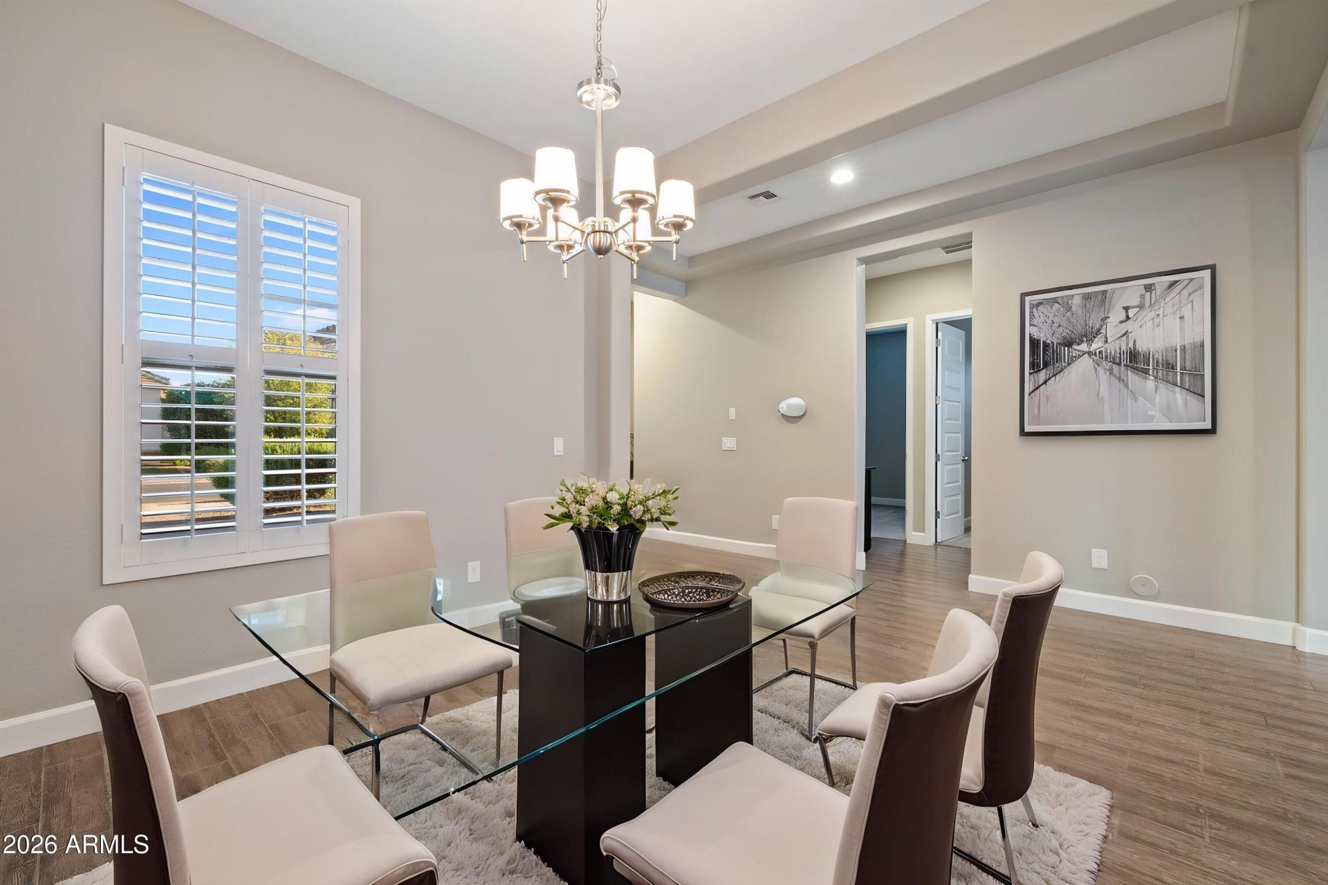 Chandlers desirable Avian Meadows!.Beautifully maintained single-level home offers the perfect blend of comfort, function, and style. Featuring 4 bedrooms, 2.5 baths, and a 3-car garage. Floorplan includes a spacious great room, formal dining room, and kitchen dining area designed for both everyday living and entertaining. Architectural details such as coffered and tray ceilings add character with stone gas fireplace. Private primary suite is a true retreat, offering a spa-inspired bath with a huge walk-in shower, private soaking tub, dual sinks, and a large walk-in closet. Outside to your private backyard oasis with a sparkling pool, travertine decking added in 18, artificial turf 26 plus separate dog run. Major updates include fresh interior paint26. HVAC and Exterior paint 2023! Ideally located close to Chandlers shopping, dining, and everyday amenities.