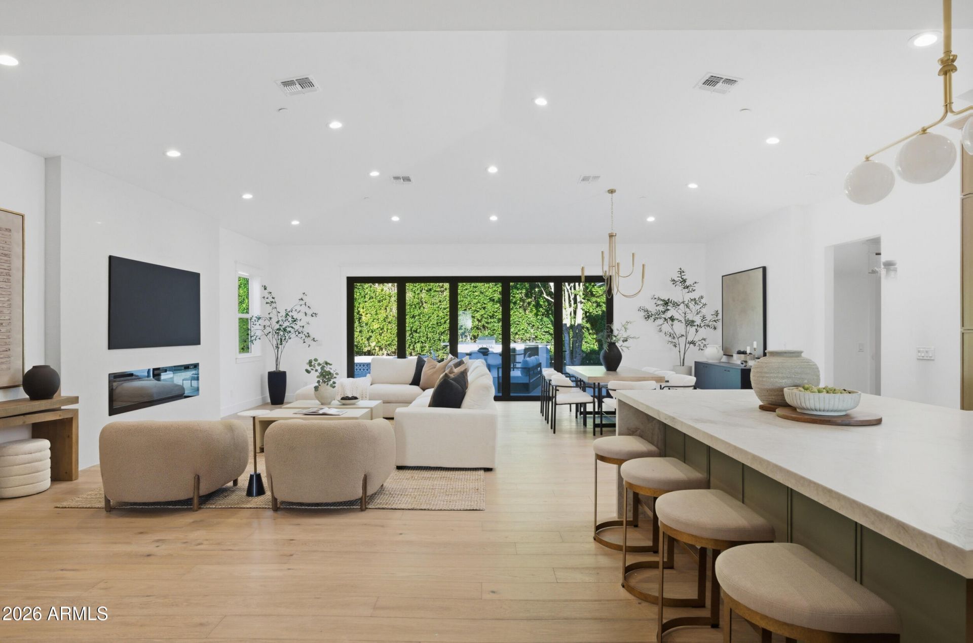 Discover the ultimate Scottsdale lifestyle in this modern luxury retreat, ideally located within walking distance to Fashion Square, Old Town Scottsdale & Camelback Mtn. Set on the largest corner lot on the block, the homes refined exterior features a white picket fence, paver driveway, lush front lawn, & custom oak garage door. Step inside to soaring ceilings, oak wood floors, & abundant natural light filling the open-concept great room. The designer kitchen is a true showstopper, centered around an oversized Taj Mahal waterfall-edge island, custom slim shaker cabinetry, gold hardware, farmhouse sink & designer appliances - perfect for entertaining or daily life. The serene primary suite offers a spa-like bath, expansive walk-through closet & sliding panoramic glass doors that seamlessly blend indoor and outdoor living. The backyard is a private paradise with a 40-ft pool, massive limestone patio & pool decking, built-in BBQ & 25+ ft Hollywood ficus hedges, & views of Camelback Mountain. This Scottsdale corner-lot jewel is new construction & ready for your luxury lifestyle.