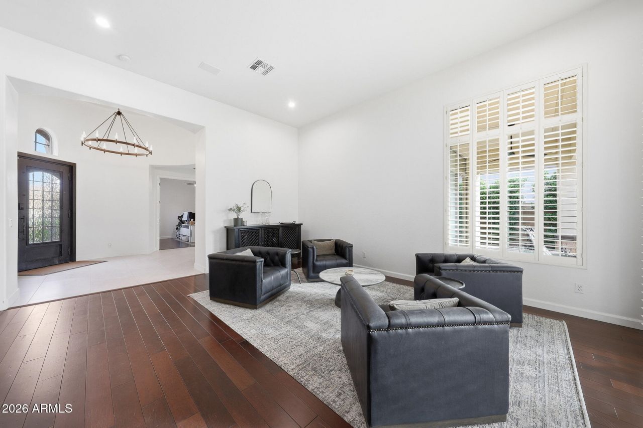 Welcome to sophisticated family living in one of Chandlers most sought-after gated communities! This beautifully updated single-story home on tree-lined streets with walking trails feels like a true neighborhood retreat. Step inside to a show-stopping chefs kitchen -- the true heart of the home -- boasting black stainless appliances, elegant brass accents, Quartz counters, a massive island/breakfast bar + another w/ prep sink, gas range, three ovens, spacious eat-in kitchen area, and walk-in pantry. Retreat to the serene owners suite with peaceful pool views and fountain sounds. Indulge in the spa bath with dual vanities, soaking tub, separate shower includes full body rain/jet system, modern cabinetry, and walk-in closet. Nearby bonus room works perfectly as a nursery, home office.... The thoughtful split floor plan delivers ultimate privacy and flexibility: On the opposite side are 4 bedrooms, 3 are en suite. Ideal for guests, teens, or multi-gen living. Plantation shutters add timeless charm and efficiency throughout. Outside, the resort-style backyard awaits: heated pool & spa, multiple covered patios, mature landscaping, built-in BBQ pergola, and fun chipping/putting greens -- perfect for weekend relaxation and family gatherings. Extensive recent renovations ($250K) make this home move-in ready with modern-classic appeal. Come see why this is the one!