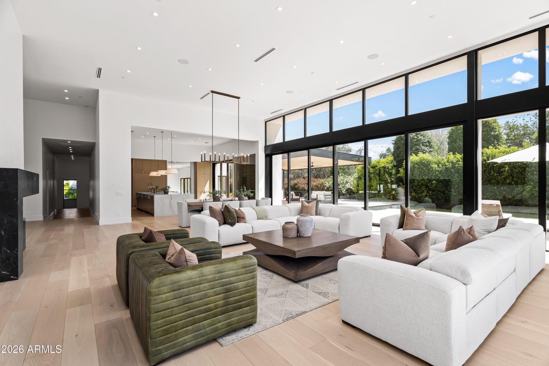 Positioned along one of Paradise Valleys most prestigious enclaves, this privately gated 1.1-acre estate showcases uninterrupted panoramic views of Camelback Mountain, including the iconic Praying Monk. Designed to maximize natural light, volume, and seamless indoor-outdoor living, the residence offers a refined blend of modern elegance and resort-style amenities. The main home features five spacious bedrooms, 5.5 bathrooms, and a versatile bonus room ideal for a home office, gym, or studio. A detached guest house provides two bedrooms, 2.5 bathrooms, a full kitchen, and private laundry--perfect for extended stays or hosting with complete independence. Inside, soaring ceilings, expansive walls of glass, and wide-plank oak flooring create a bright, open atmosphere. The great room serves as the centerpiece, highlighted by dramatic sliding glass doors and a sleek marble fireplace, effortlessly connecting to the outdoor living spaces. The open-concept kitchen, dining, and living areas are designed for both everyday living and elevated entertaining. The chefs kitchen is equipped with premium Wolf and Sub-Zero appliances, a gas range, dual ovens and dishwashers, built-in coffee and ice makers, and a striking climate-controlled wine wall. The primary suite offers a serene retreat with tranquil views and private access to the backyard, along with a spa-inspired bathroom featuring a sculptural stone soaking tub, oversized steam shower, dual vanities, custom wood cabinetry with abundant storage, and a private water closet. Outdoors, the showstopping custom pool and spa include an extended lap lane, surrounded by multiple lounging and dining areas, fire features, and a covered steel-and-wood patio with a fully equipped outdoor kitchen. Added amenities include a pickleball court and putting green. Additional highlights include a six-car garage and a prime location just minutes from Arizonas premier resorts, spas, fine dining, and shopping.