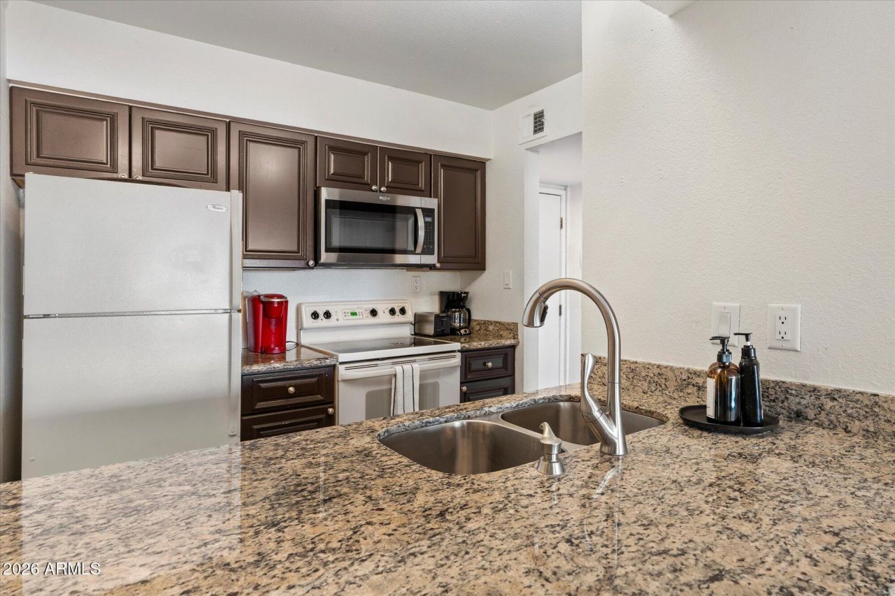Charming southwest inspired condo in the heart of Old Town Scottsdale is the perfect opportunity for a vacation home, investment property, or primary residence. Active Airbnb property comes fully furnished and all utilities including electric, water, air conditioning, heat and basic cable are included the HOA Fee, allowing for instant income. New cabinetry and granite countertops in the kitchen open to the living area and balcony overlooking mountains in the distance, making for a seamless entertaining space. Primary bedroom features a walk-in closet, dual vanity and lots of storage. Conveniently located in the complex, this top floor unit provides easy access to the resort-style amenities including heated pool and spa, BBQ ramada and fitness center.