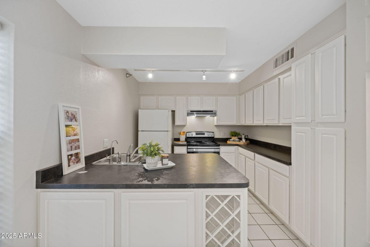 SUPER CLEAN ground floor condo with a fantastic resort pool view, sunny south-facing patio & great location! Just updated with new paint & carpet, new dishwasher (2025), newer HVAC (2021) & washer/dryer (2021). Spacious kitchen with white cabinets, tons of storage & refrigerator included. Great room features built-ins, great natural light & a sliding door that opens to the saltillo-tiled patio overlooking the pool. Spacious bedroom with a great walk-in closet and pool view. Lovely bathroom with a raised sink & quartz counters + laundry in unit ! HOA fee includes roof repair/eplacement, water, sewer, garbage & ext. maintenance. One covered parking spot near unit. Amazing location in the heart of Scottsdale, near the 101 Freeway & minutes to fantastic shopping, restaurants, bars, & gyms!